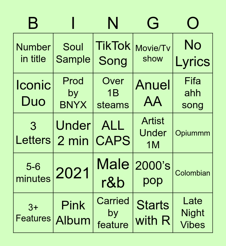 This bingo card has a free space and 24 words: 2021, Pink Album, Over 1B steams, 3+ Features, No Lyrics, Number in title, Iconic Duo, Soul Sample, Artist Under 1M, Male r&b, Anuel AA, 3 Letters, 2000’s pop, Colombian, Prod by BNYX, Starts with R, Opiummm, TikTok Song, Fifa ahh song, Under 2 min, Late Night Vibes, 5-6 minutes, Movie/Tv show and Carried by feature.