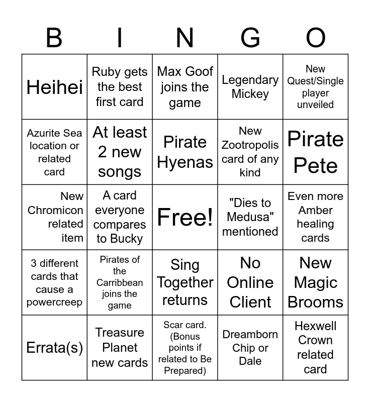 This bingo card has a free space and 24 words: Pirates of the Carribbean joins the game, Treasure Planet new cards, Pirate Hyenas, Errata(s), New Quest/Single player unveiled, Heihei, Azurite Sea location or related card, Ruby gets the best first card, "Dies to Medusa" mentioned, Sing Together returns, New Zootropolis card of any kind, New Chromicon related item, No Online Client, New Magic Brooms, At least 2 new songs, Dreamborn Chip or Dale, Even more Amber healing cards, Max Goof joins the game, Pirate Pete, A card everyone compares to Bucky, Hexwell Crown related card, 3 different cards that cause a powercreep, Legendary Mickey and Scar card. (Bonus points if related to Be Prepared).