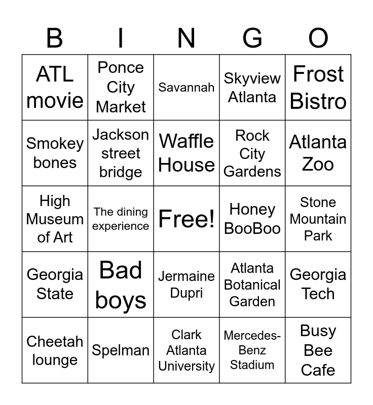 This bingo card has a free space and 75 words: Hartsfield-Jackson Atlanta International Airport, Buckhead, Savannah, Atlanta, Augusta, Decatur, Marietta, Columbus, Georgia, Peach, Coca-Cola museum, Georgia aquarium, Waffle House, Smokey bones, Churches chicken, The dining experience, Trap city cafe, Busy Bee Cafe, Trap museum, Frost Bistro, African American History Museum, High Museum of Art, Jackson street bridge, Ponce City Market, Skyview Atlanta, Cascades, Fox Theater, Tyler Perry Studio, Children Museum of Atlanta, Buckhead Nail and Toe Spa, Lego Discovery Center Atlanta, Fun spot America Atlanta, Black Wall Street market, Atlanta Botanical Garden, Atlanta Zoo, Rock City Gardens, Piedmont Park, Centennial Olympic Park, Stone Mountain Park, Mercedes-Benz Stadium, State Farm Arena, Lakewood Amphitheatre, Magic City, Onyx Gentlemen club, King of diamonds Atlanta, Pink pony, Cheetah lounge, ATL movie, Rich Homie Quan, Soulja Boy, 2 chains, Jermaine Dupri, Lil Yachty, Waka Flocka Flame, Future, Latto, Stomp the Yard, The walking dead, The hunger games, Drumline, Bad boys, Fast and Furious, Ride along, Love and Hip Hop, Real Housewives of ATL, Honey BooBoo, Atlanta Braves, Atlanta Falcons, Atlanta Hawks, Georgia Tech, Georgia State, Spelman, Moorehouse, Clark Atlanta University and Peachtree Street.