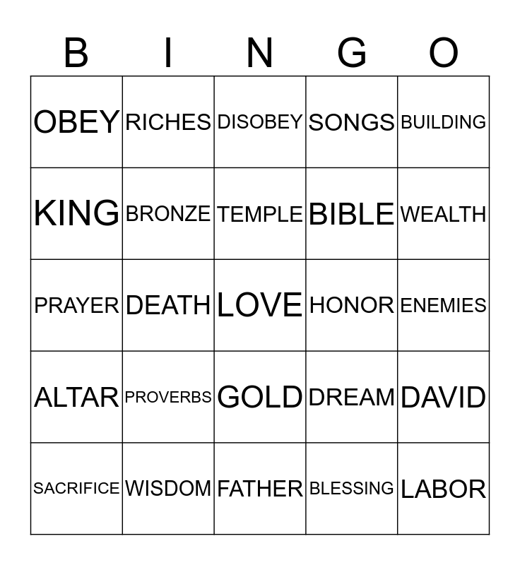 This bingo card has a free space and 24 words: PROVERBS, WISDOM, TEMPLE, SACRIFICE, BUILDING, OBEY, KING, RICHES, HONOR, GOLD, BIBLE, PRAYER, DREAM, DAVID, BRONZE, BLESSING, ENEMIES, DISOBEY, WEALTH, DEATH, LABOR, ALTAR, SONGS and FATHER.