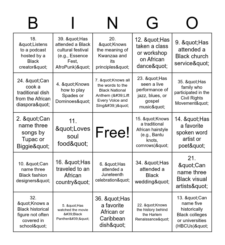 This bingo card has a free space and 40 words: 1. "Has a favorite Black-owned business", 2. "Can name three songs by Tupac or Biggie", 3. "Has visited a historically Black neighborhood", 4. "Knows how to play Spades or Dominoes", 5. "Has watched the movie 'Black Panther'", 6. "Has attended a Juneteenth celebration", 7. "Knows all the words to the Black National Anthem ('Lift Every Voice and Sing')", 8. "Has participated in a Black Lives Matter march or protest", 9. "Has attended a Black church service", 10. "Can name three Black fashion designers", 11. "Loves soul food", 12. "Has taken a class or workshop on African dance", 13. "Can name five historically Black colleges or universities (HBCUs)", 14. "Has a favorite spoken word artist or poet", 15. "Knows a traditional African hairstyle (e.g., Bantu knots, cornrows)", 16. "Has traveled to an African country", 17. "Can name three famous Black scientists or inventors", 18. "Listens to a podcast hosted by a Black creator", 19. "Has read 'The Autobiography of Malcolm X'", 20. "Knows the meaning of Kwanzaa and its principles", 21. "Can name three Black visual artists", 22. "Knows the history behind the Harlem Renaissance", 23. "Has seen a live performance of jazz, blues, or gospel music", 24. "Can cook a traditional dish from the African diaspora", 25. "Has attended a Black family reunion", 26. "Knows how to play double dutch", 27. "Can name a famous Black entrepreneur or business leader", 28. "Has a favorite classic Black movie", 29. "Watches a TV show with a predominantly Black cast", 30. "Can name a famous Black author or poet", 31. "Has been to a Black art exhibit or museum", 32. "Knows a Black historical figure not often covered in school", 33. "Follows a Black fitness or wellness influencer", 34. "Has attended a Black wedding", 35. "Has family who participated in the Civil Rights Movement", 36. "Has a favorite African or Caribbean dish", 37. "Knows the significance of Afrofuturism", 38. "Can name three famous Black comedians", 39. "Has attended a Black cultural festival (e.g., Essence Fest, AfroPunk)" and 40. "Can name three famous Black athletes".