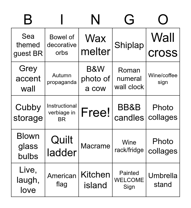This bingo card has a free space and 24 words: Quilt ladder, American flag, B&W photo of a cow, Live, laugh, love, Wall cross, Sea themed guest BR, Grey accent wall, Bowel of decorative orbs, BB&B candles, Macrame, Roman numeral wall clock, Cubby storage, Wine rack/fridge, Photo collages, Autumn propaganda, Painted WELCOME Sign, Photo collages, Wax melter, Wine/coffee sign, Instructional verbiage in BR, Umbrella stand, Blown glass bulbs, Shiplap and Kitchen island.