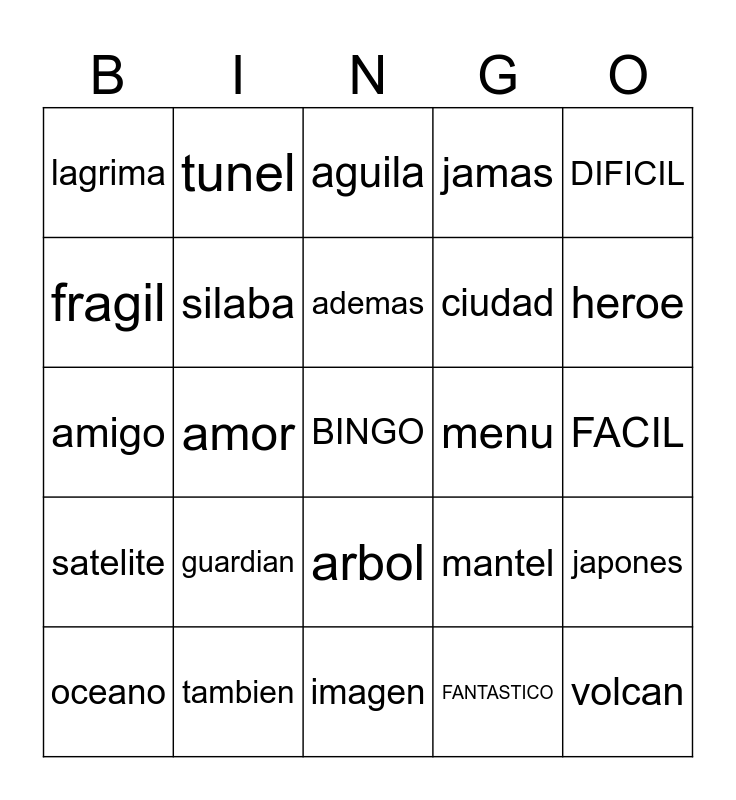 This bingo card has 40 words: imagen, amor, matematica, mantel, volcan, amigo, silaba, azucar, ciudad, japones, lagrima, tunel, BINGO, FANTASTICO, FACIL, fragil, numero, aguila, tonica, DIFICIL, satelite, tambien, ademas, menu, sabor, lapiz, movil, aleman, miercoles, corazon, mascara, guardian, arbol, alegria, heroe, oceano, romantico, imagen, jamas and ortografia.