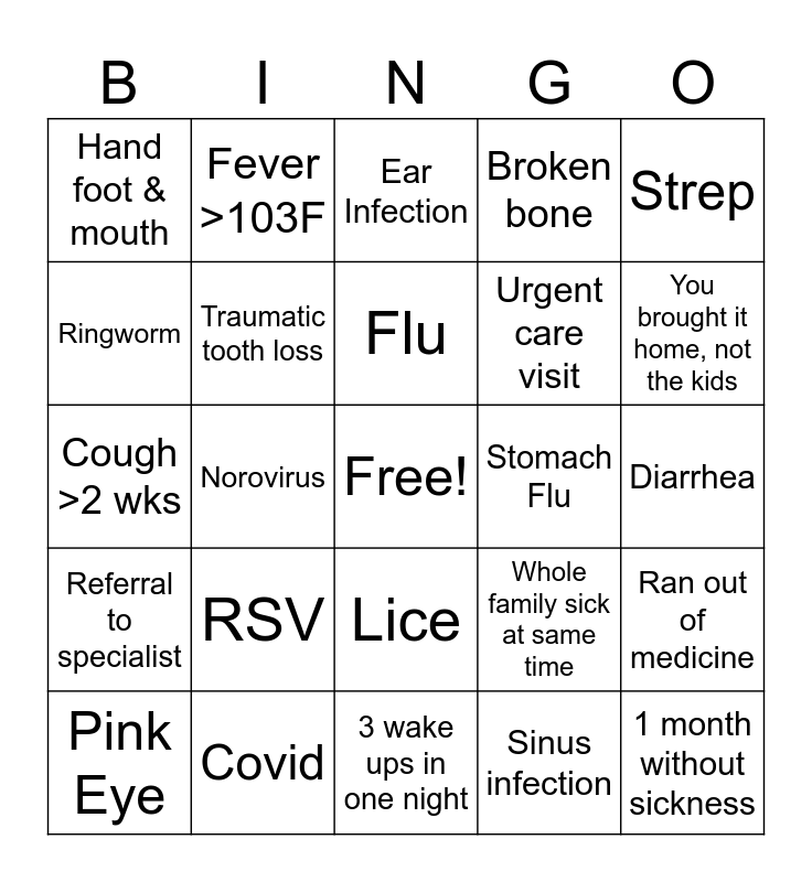 This bingo card has a free space and 24 words: RSV, Covid, Flu, Pink Eye, Strep, Hand foot & mouth, Ringworm, Fever >103F, Stomach Flu, Lice, Urgent care visit, Cough >2 wks, Whole family sick at same time, Ran out of medicine, Traumatic tooth loss, Sinus infection, Diarrhea, Ear Infection, You brought it home, not the kids, Norovirus, 1 month without sickness, Referral to specialist, Broken bone and 3 wake ups in one night.