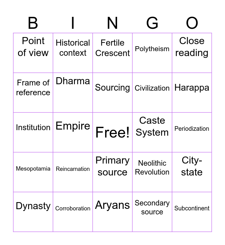 This bingo card has a free space and 26 words: Primary source, Secondary source, Sourcing, Corroboration, Close reading, Point of view, Frame of reference, Historical context, Periodization, Neolithic Revolution, Civilization, Institution, City-state, Dynasty, Empire, Pictographic script, Polytheism, Mesopotamia, Fertile Crescent, Subcontinent, Harappa, Aryans, Caste System, Reincarnation, Dharma and Karma.