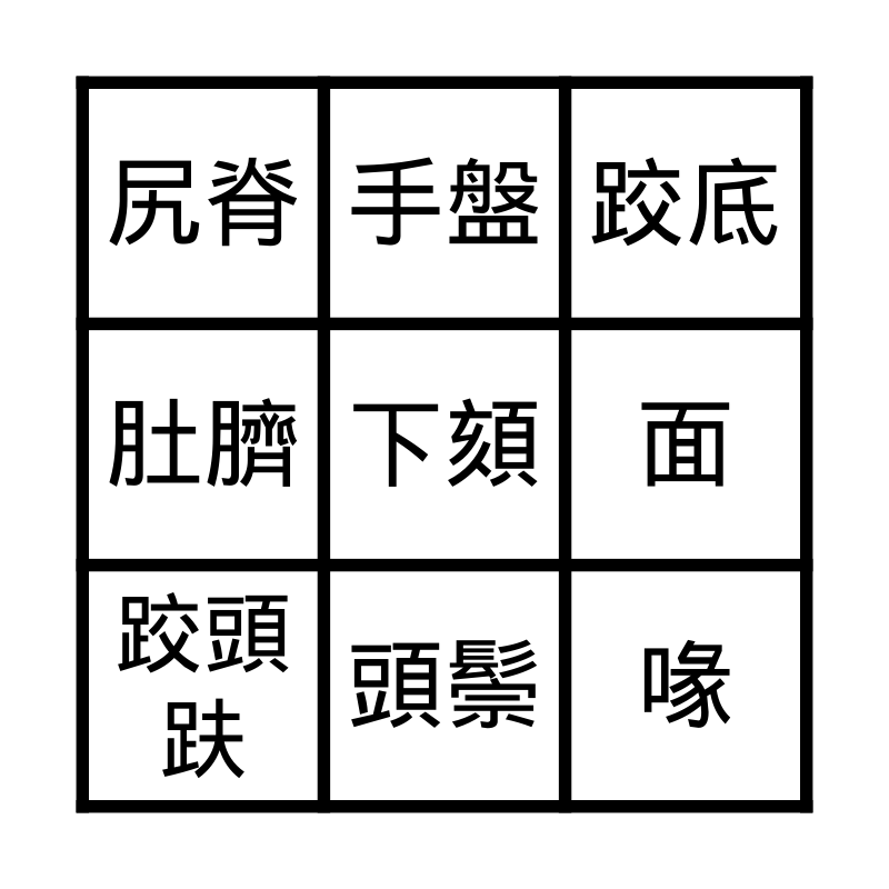 This bingo card has 12 words: 目睭, 喙, 下頦, 面, 手盤, 跤底, 頭鬃, 尻川, 尻脊, 肚臍, 跤頭趺 and 耳空.