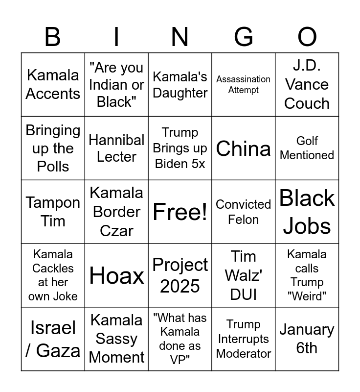 This bingo card has a free space and 24 words: Hoax, Kamala Sassy Moment, Trump Brings up Biden 5x, Israel / Gaza, J.D. Vance Couch, Kamala Accents, Bringing up the Polls, "Are you Indian or Black", Convicted Felon, Project 2025, China, Tampon Tim, Tim Walz' DUI, Kamala calls Trump "Weird", Hannibal Lecter, Trump Interrupts Moderator, Black Jobs, Kamala's Daughter, Golf Mentioned, Kamala Border Czar, January 6th, Kamala Cackles at her own Joke, Assassination Attempt and "What has Kamala done as VP".