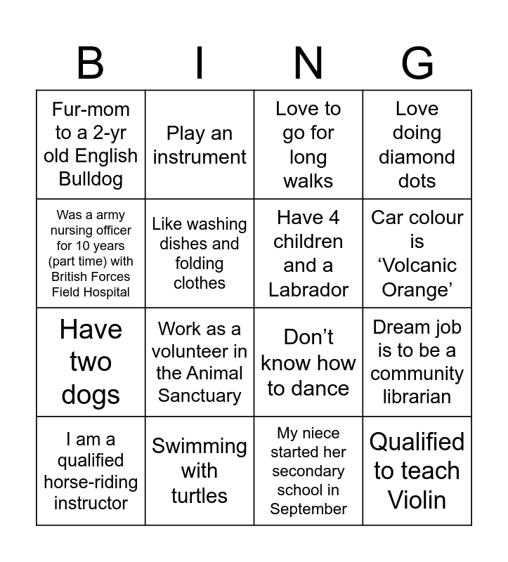 This bingo card has 28 words: Love frogs, Love Pilates, Have two dogs, All about cleaning and organization, Like washing dishes and folding clothes, Love to go for long walks, Play an instrument, Qualified to teach Violin, Swimming with turtles, Learning ‘astrology, Don’t know how to dance, Love doing diamond dots, Don't drink coffee at all, My favorite animal is the elephant (but I do not keep one as a pet)., Work as a volunteer in the Animal Sanctuary, Some friends/relatives used to call me timetable, Reduced 10 kg weight from day 1 of PPD, Have 4 children and a Labrador, Car colour is ‘Volcanic Orange’, Walk >250km from Portugal to Spain for the Camino de Santiago in October, Fur-mom to a 2-yr old English Bulldog, Plant fruit bearing trees, I am a qualified horse-riding instructor, Dream job is to be a community librarian, My niece started her secondary school in September, Purchased a SMART working desk, Was a army nursing officer for 10 years (part time) with British Forces Field Hospital and Completed piano studies at the age of 19 years old.