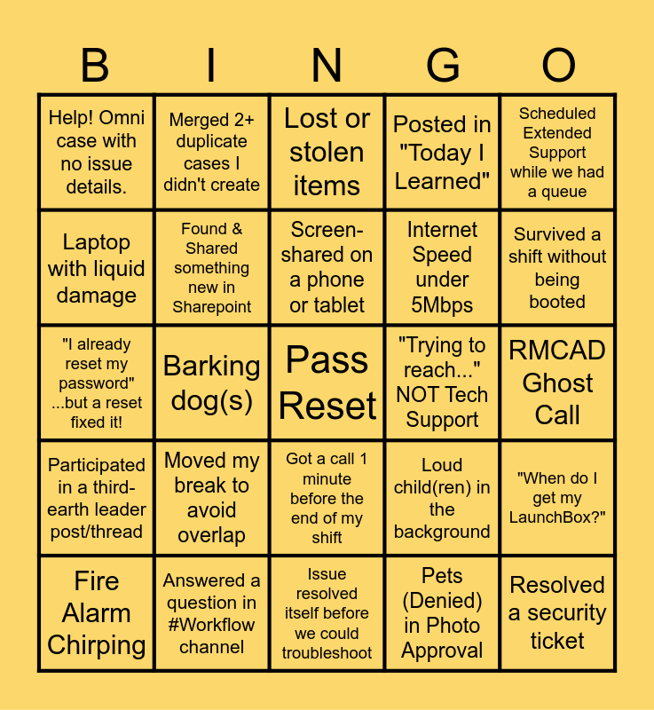This bingo card has a free space and 24 words: Moved my break to avoid overlap, Answered a question in #Workflow channel, Screen-shared on a phone or tablet, Fire Alarm Chirping, Scheduled Extended Support while we had a queue, Help! Omni case with no issue details., Laptop with liquid damage, Merged 2+ duplicate cases I didn't create, "Trying to reach..." NOT Tech Support, Got a call 1 minute before the end of my shift, Internet Speed under 5Mbps, "I already reset my password" ...but a reset fixed it!, Loud child(ren) in the background, "When do I get my LaunchBox?", Found & Shared something new in Sharepoint, Pets (Denied) in Photo Approval, RMCAD Ghost Call, Lost or stolen items, Survived a shift without being booted, Barking dog(s), Resolved a security ticket, Participated in a third-earth leader post/thread, Posted in "Today I Learned" and Issue resolved itself before we could troubleshoot.