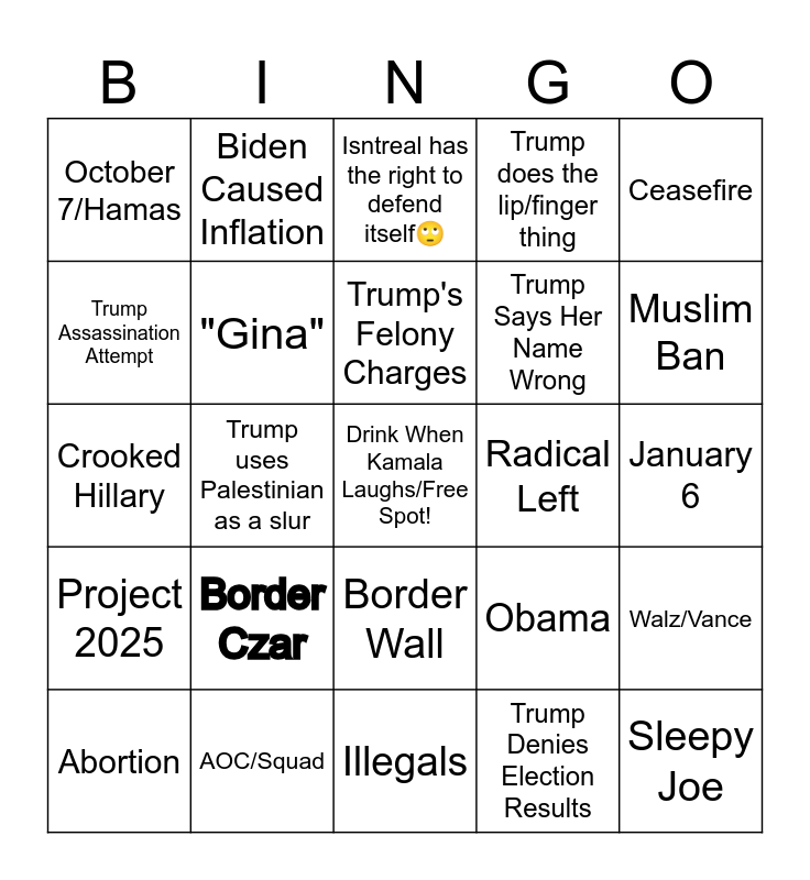 This bingo card has a free space and 24 words: Border Czar, AOC/Squad, Trump's Felony Charges, Abortion, Ceasefire, October 7/Hamas, Trump Assassination Attempt, Biden Caused Inflation, Radical Left, Border Wall, Trump Says Her Name Wrong, Crooked Hillary, Obama, Walz/Vance, "Gina", Trump Denies Election Results, January 6, Isntreal has the right to defend itself🙄, Muslim Ban, Trump uses Palestinian as a slur, Sleepy Joe, Project 2025, Trump does the lip/finger thing and Illegals.