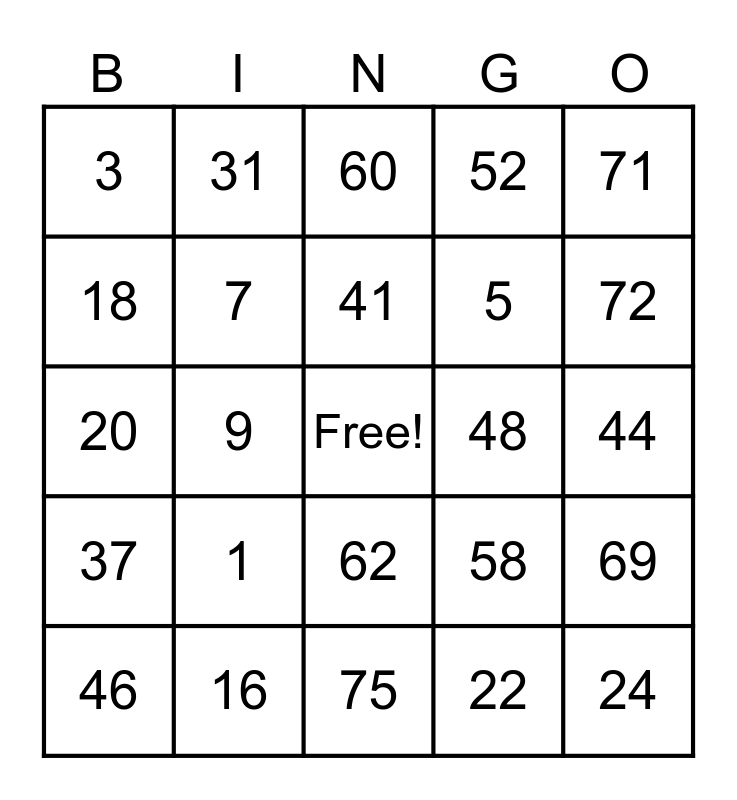 This bingo card has a free space and 24 words: 1, 16, 41, 46, 71, 3, 18, 31, 48, 62, 5, 20, 58, 69, 7, 22, 44, 60, 72, 9, 24, 37, 52 and 75.