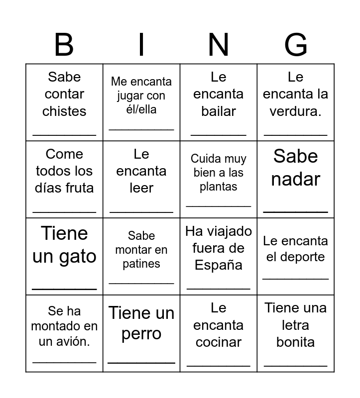This bingo card has 16 words: Tiene un perro _______, Le encanta el deporte _________, Le encanta bailar _______, Sabe contar chistes ________, Tiene un gato ______, Me encanta jugar con él/ella __________, Ha viajado fuera de España ________, Le encanta cocinar ________, Come todos los días fruta ________, Le encanta leer ________, Se ha montado en un avión. _________, Le encanta la verdura. ________, Sabe montar en patines __________, Sabe nadar ______, Cuida muy bien a las plantas __________ and Tiene una letra bonita ________.