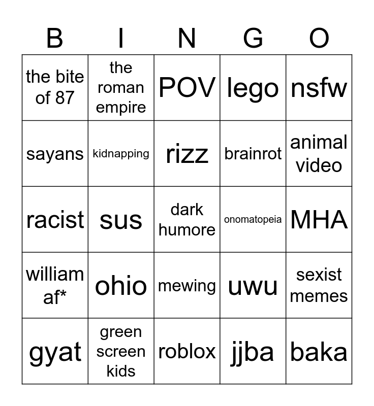 This bingo card has a free space and 24 words: ohio, green screen kids, rizz, gyat, nsfw, the bite of 87, sayans, the roman empire, onomatopeia, mewing, brainrot, racist, uwu, sexist memes, kidnapping, jjba, MHA, POV, animal video, sus, baka, william af*, lego and roblox.