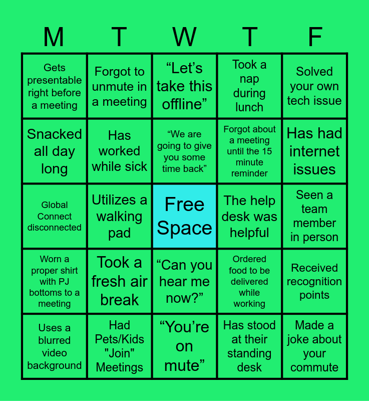 This bingo card has a free space and 47 words: Washed the dishes during break, Had Pets/Kids "Join" Meetings, “I wish there was more I could do”, Always looks forward to 2 hour early release days, Has had internet issues, Worn a proper shirt with PJ bottoms to a meeting, Forgot to unmute in a meeting, “Can someone prioritize…”, Forgot about a meeting until the 15 minute reminder, Made a joke about your commute, Snacked all day long, Has worked while sick, Has stood at their standing desk, Received recognition points, Overslept, Put in a load of laundry, “We are going to give you some time back”, Ordered food to be delivered while working, Virtual lunch with colleague, Gets presentable right before a meeting, Took a fresh air break, "I have to jump on another call", Took a nap during lunch, Solved your own tech issue, Attended a meeting you probably didn’t need to attend, Utilizes a walking pad, “Can you hear me now?”, Had 3+ meetings in one day, Seen a team member in person, Global Connect disconnected, Requested a meeting slide deck, “Can you see my screen?”, Spent time working outdoors, Has a work playlist, Been flooded with Yammer posts, Forgot the day of the week, “You’re on mute”, Received a rude email/voicemail, Took a walk during break, Uses a blurred video background, Rearranged your workspace, “Let’s take this offline”, The help desk was helpful, Sent a Gif to a co-worker, Uses a green screen background, Always has coffee or tea and “Is everyone here?”.