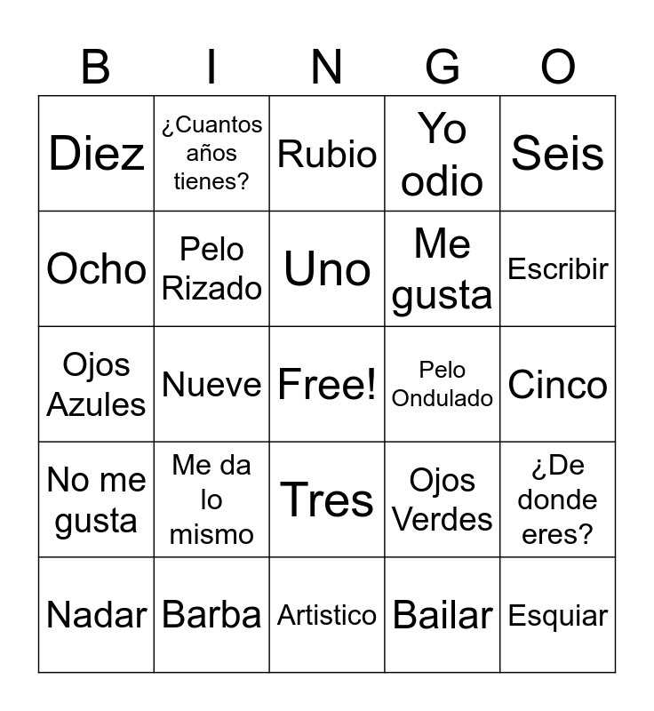 This bingo card has a free space and 67 words: ¿Como te llamas?, Me llamo, Soy de, ¿De donde eres?, ¿De donde vives?, Yo vivo en ___, ¿Cuantos años tienes?, Tengo ___ años, Uno, Dos, Tres, Cuatro, Cinco, Seis, Siete, Ocho, Nueve, Diez, Me encanta, Me gusta, Me da lo mismo, No me gusta, Yo odio, Bailar, Cantar, Comer, Correr, Dibujar, Escribir, Escuchar Música, Esquiar, Estudiar, Leer, Montar en Bicicleta, Montar Caballos, Nadar, Ojos Marrones, Ojos Verdes, Ojos Azules, Pelo Largo, Pelo Corto, Pelo Rizado, Pelo Ondulado, Pelo Liso, Calvo, Gafas, Bigote, Barba, Pelinegro, Castaño, Rubio, Pelirrojo, Alto, Bajo, Amable, Artistico, Atletico, Comico, Curioso, Cariñoso, Considerado, Divertido, Estudioso, Generoso, Inteligente, Paciente and Timido.