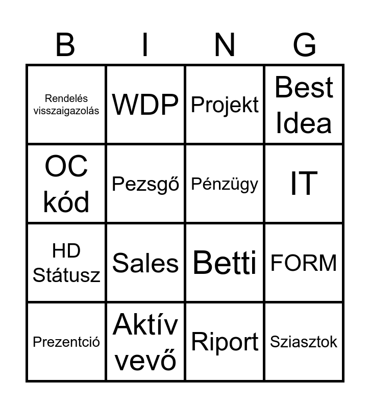 This bingo card has 16 words: Aktív vevő, FORM, Projekt, Rendelés visszaigazolás, HD Státusz, WDP, Betti, Riport, OC kód, Pezsgő, Prezentció, Best Idea, Sales, IT, Pénzügy and Sziasztok.
