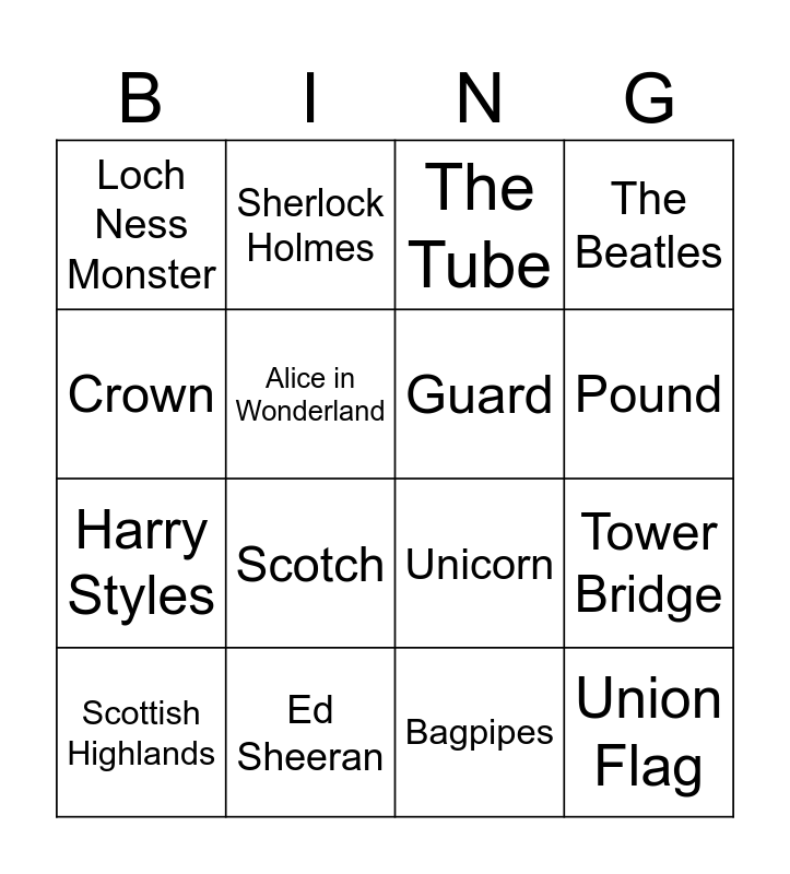 This bingo card has 33 words: Double Decker bus, Phonebooth, Tower Bridge, London Eye, Union Flag, Guard, Crown, Big Ben, Sherlock Holmes, Guinness, Pound, The Tube, Corgi, Spice Girls, Ed Sheeran, Scotch, Tea, Unicorn, Windsor Castle, Harry Potter, King Charles, Charles Dickens, Loch Ness Monster, Bagpipes, Kilt, Scottish Highlands, The Beatles, Harry Styles, Alice in Wonderland, Hobbit, VIking, Fish and Chips and English Breakfast.