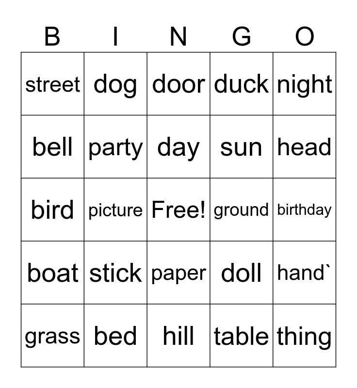 This bingo card has a free space and 24 words: stick, bed, day, grass, night, street, bell, dog, ground, paper, sun, bird, doll, hand`, party, table, birthday, door, head, picture, thing, boat, duck and hill.