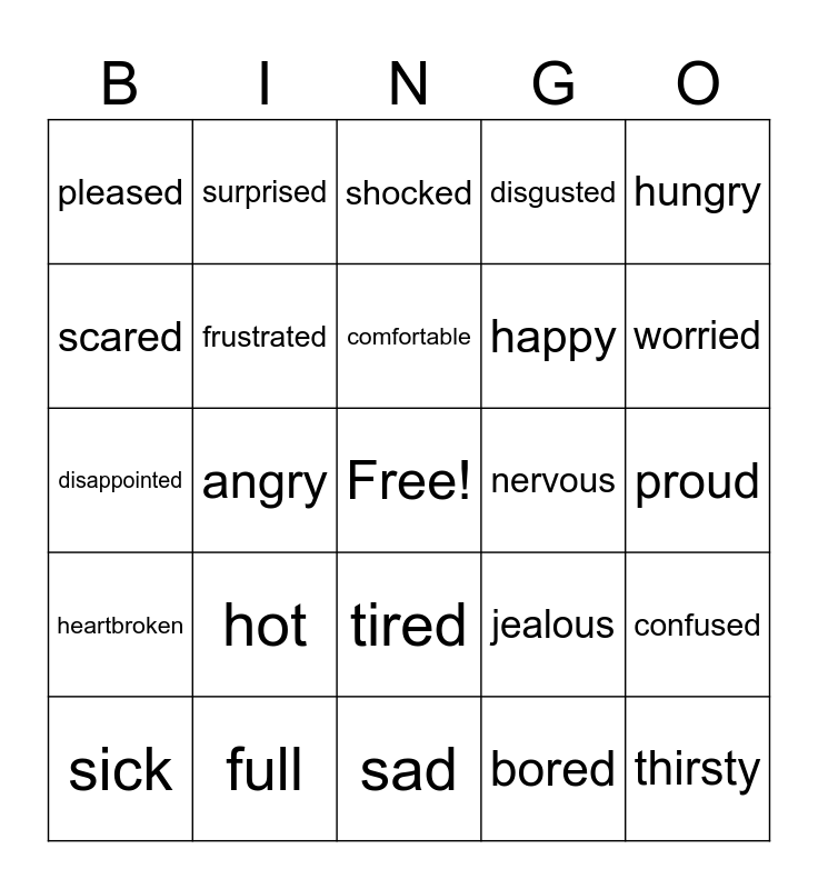 This bingo card has a free space and 26 words: tired, bored, comfortable, full, hungry, pleased, scared, surprised, proud, jealous, happy, disappointed, confused, sick, angry, annoyed, disgusted, heartbroken, shocked, thirsty, worried, sad, nervous, hot, frustrated and cold.