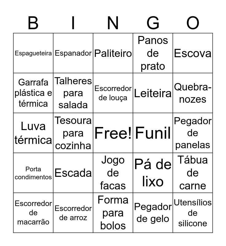 This bingo card has a free space and 24 words: Escada, Escorredor de arroz, Escorredor de louça, Escorredor de macarrão, Escova, Espagueteira, Garrafa plástica e térmica, Espanador, Funil, Jogo de facas, Leiteira, Luva térmica, Pá de lixo, Tábua de carne, Talheres para salada, Pegador de gelo, Pegador de panelas, Paliteiro, Quebra-nozes, Tesoura para cozinha, Utensílios de silicone, Porta condimentos, Panos de prato and Forma para bolos.