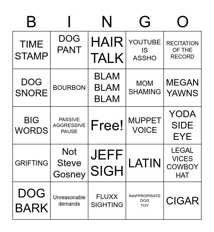 This bingo card has a free space and 24 words: Not Steve Gosney, Unreasonable demands, BLAM BLAM BLAM, DOG BARK, RECITATION OF THE RECORD, TIME STAMP, DOG SNORE, DOG PANT, MUPPET VOICE, JEFF SIGH, MOM SHAMING, BIG WORDS, LATIN, LEGAL VICES COWBOY HAT, BOURBON, INAPPROPRIATE DOG TOY, YODA SIDE EYE, HAIR TALK, MEGAN YAWNS, PASSIVE AGGRESSIVE PAUSE, CIGAR, GRIFTING, YOUTUBE IS ASSHO and FLUXX SIGHTING.