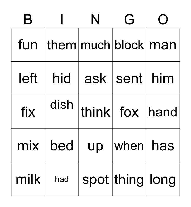This bingo card has 25 words: bed, spot, ask, milk, man, fun, left, them, fox, up, sent, fix, when, has, hid, long, hand, much, him, dish, think, had, mix, block and thing.