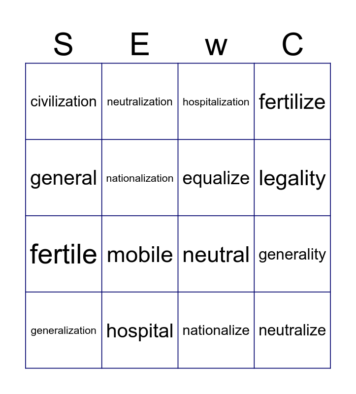This bingo card has 56 words: civil, civility, civilize, civilization, equal, equality, equalize, equalization, fertile, fertility, fertilize, fertilization, final, finality, finalize, finalization, general, generality, generalize, generalization, hospital, hospitality, hospitalize, hospitalization, legal, legality, legalize, legalization, mobile, mobility, mobilize, mobilization, national, nationality, nationalize, nationalization, neutral, neutrality, neutralize, neutralization, personal, personality, personalize, personalization, real, reality, realize, realization, stable, stability, stabilize, stabilization, sterile, sterility, sterilize and sterilization.