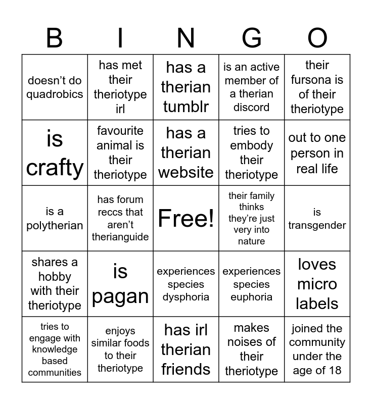 This bingo card has a free space and 34 words: owns gear, makes noises of their theriotype, personality matches their theriotype, good at drawing, shares a hobby with their theriotype, favourite animal is their theriotype, their fursona is of their theriotype, tries to engage with knowledge based communities, has met their theriotype irl, physically identifies as their theriotype, has a therian website, has a therian tumblr, makes their own gear, everyone thinks they resemble their theriotype, their family thinks they’re just very into nature, out to one person in real life, enjoys similar foods to their theriotype, is a polytherian, is pagan, experiences species euphoria, experiences species dysphoria, experiences shifts, doesn’t do quadrobics, is transgender, has irl therian friends, joined the community under the age of 18, is an active member of a therian discord, is neurodivergent, tries to embody their theriotype, is crafty, joined the community 18 or over, has forum reccs that aren’t therianguide, loves micro labels and doesn’t use any microlabels.