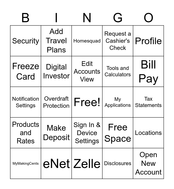 This bingo card has a free space and 25 words: Make Deposit, Zelle, Edit Accounts View, MyMakingCents, Profile, Security, Freeze Card, Add Travel Plans, My Applications, Sign In & Device Settings, Tools and Calculators, Notification Settings, Free Space, Locations, Digital Investor, Show More Details, Tax Statements, Homesquad, Bill Pay, Overdraft Protection, Open New Account, eNet, Products and Rates, Request a Cashier's Check and Disclosures.
