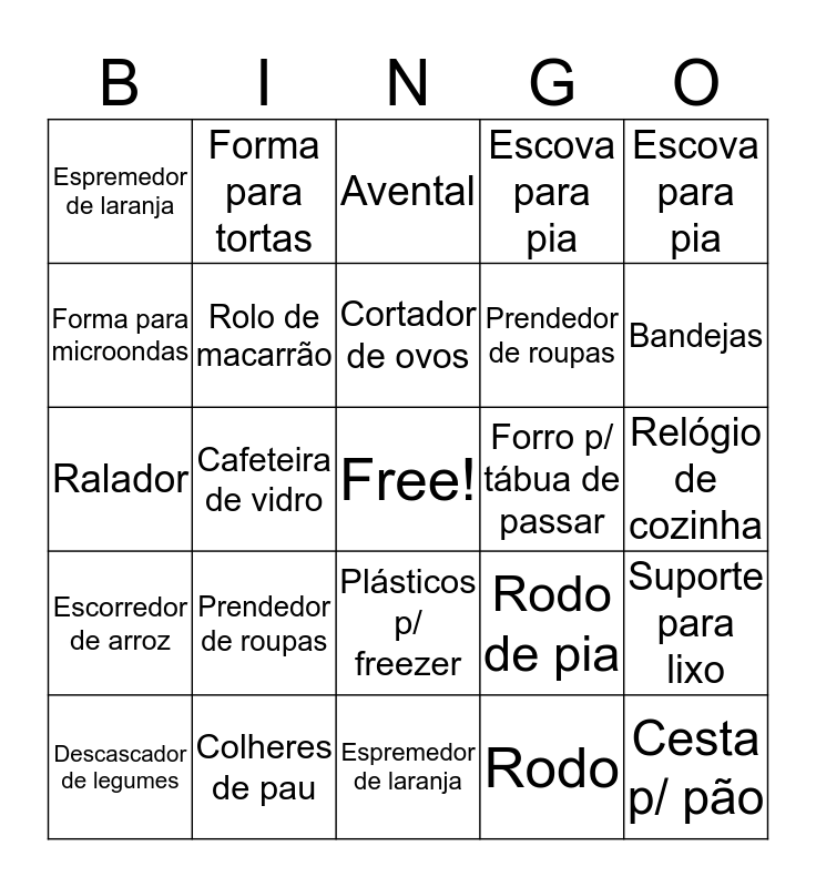 ⚠ This card has duplicate items: Prendedor de roupas (2), Escova para pia (2), Espremedor de laranja (2)