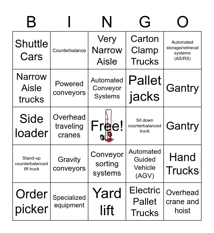 This bingo card has 1 images, a free space and 28 words: Hand Trucks, Platform trucks, Pallet jacks, Electric Pallet Trucks, Narrow Aisle trucks, Very Narrow Aisle, Counterbalance, Stand-up counterbalanced lift truck, Sit down counterbalanced truck, Order picker, Side loader, Carton Clamp Trucks, Specialized equipment, Yard lift, Gantry, Dock board/plate, Gravity conveyors, Powered conveyors, Automated Conveyor Systems, Conveyor sorting systems, Shuttle Cars, Overhead traveling conveyors, Overhead crane and hoist, Overhead traveling cranes, Gantry, Automated Guided Vehicle (AGV), Automated storage/retrieval systems (AS/RS) and Shuttle Cars.