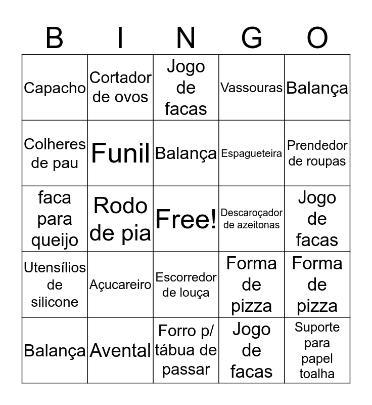 This bingo card has a free space and 24 words: Açucareiro, Avental, Balança, Balança, Balança, Capacho, Colheres de pau, Cortador de ovos, Descaroçador de azeitonas, Escorredor de louça, Espagueteira, faca para queijo, Forma de pizza, Forma de pizza, Funil, Jogo de facas, Jogo de facas, Jogo de facas, Prendedor de roupas, Rodo de pia, Suporte para papel toalha, Utensílios de silicone, Vassouras and Forro p/ tábua de passar.