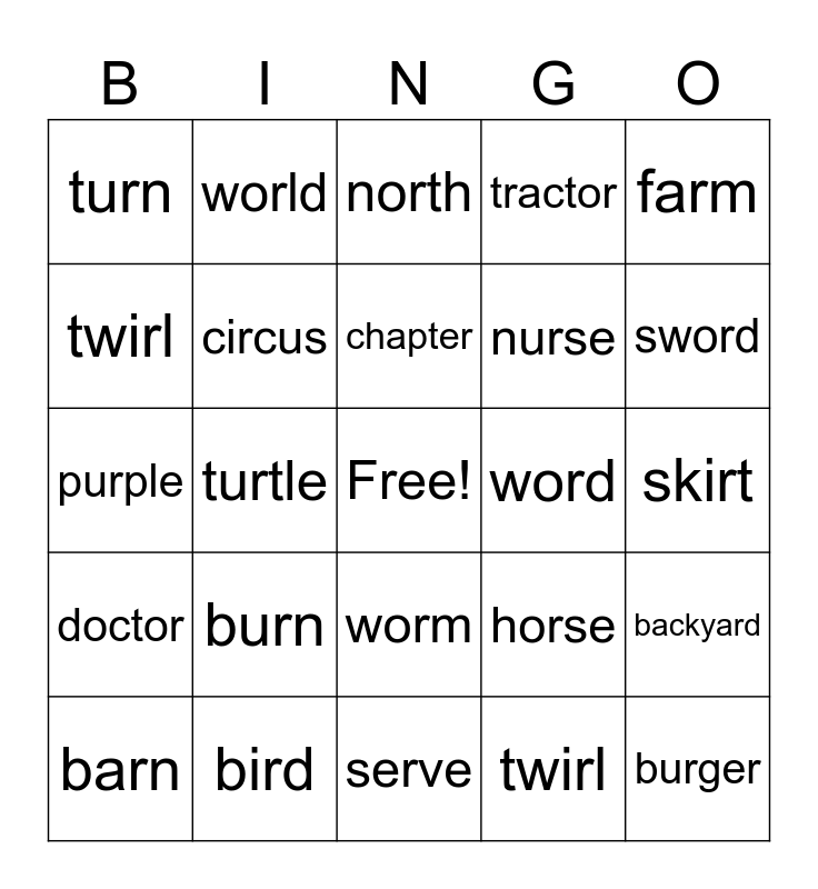This bingo card has a free space and 24 words: burn, bird, chapter, barn, farm, turn, twirl, world, word, worm, nurse, purple, horse, backyard, circus, twirl, skirt, north, sword, turtle, burger, doctor, tractor and serve.