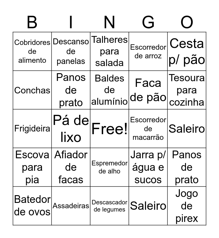 This bingo card has a free space and 24 words: Afiador de facas, Assadeiras, Baldes de alumínio, Batedor de ovos, Cesta p/ pão, Cobridores de alimento, Conchas, Descanso de panelas, Escorredor de macarrão, Espremedor de alho, Faca de pão, Frigideira, Jarra p/ água e sucos, Panos de prato, Panos de prato, Saleiro, Saleiro, Talheres para salada, Tesoura para cozinha, Pá de lixo, Jogo de pirex, Escova para pia, Escorredor de arroz and Descascador de legumes.