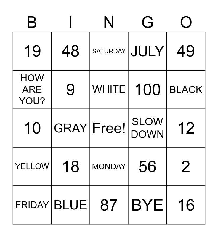 This bingo card has a free space and 114 words: JANUARY, FEBRUARY, MARCH, APRIL, MAY, JUNE, JULY, AUGUST, SEPTEMBER, OCTOBER, NOVEMBER, DECEMBER, SPRING, SUMMER, WINTER, FALL, MONDAY, TUESDAY, WEDNESDAY, THURSDAY, FRIDAY, SATURDAY, SUNDAY, RED, GREEN, YELLOW, BLUE, ORANGE, SILVER, GOLD, BLACK, WHITE, GRAY, BROWN, PINK, PURPLE, HEY, WHAT'S UP, I'M SORRY, THANKS, YOU'RE WELCOME, MY NAME IS, YO SOY DE, SEE YOU SOON, SEE YOU LATER, SEE YOU TOMORROW, BYE, HOW ARE YOU?, I'M GOOD, I DON'T KNOW, LISTEN, SLOW DOWN, REPEAT, PLEASE, RAISE YOUR HAND, STAND UP, SIT DOWN, LOOK AT THE BOARD, HOW DO YOU SAY, 1, 2, 3, 4, 5, 6, 7, 8, 9, 10, 11, 12, 17, 13, 14, 15, 16, 18, 19, 20, 30, 33, 48, 40, 56, 100, 37, 94, 22, 28, 96, 90, 23, 41, 49, 59, 47, 31, 34, 66, 61, 60, 77, 78, 71, 82, 85, 58, 87, 80, 0, EXCUSE ME, WHERE ARE YOU FROM, TODAY and YESTERDAY.
