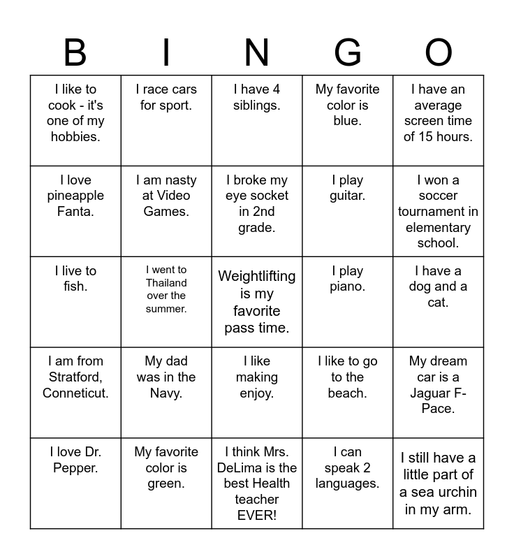 This bingo card has a free space and 24 words: My dad was in the Navy., My favorite color is green., I broke my eye socket in 2nd grade., I love Dr. Pepper., I have an average screen time of 15 hours., I like to cook - it's one of my hobbies., I love pineapple Fanta., I race cars for sport., I play piano., I like making enjoy., I play guitar., I live to fish., I like to go to the beach., My dream car is a Jaguar F-Pace., I am nasty at Video Games., I can speak 2 languages., I have a dog and a cat., I have 4 siblings., I won a soccer tournament in elementary school., I went to Thailand over the summer., I still have a little part of a sea urchin in my arm., I am from Stratford, Conneticut., My favorite color is blue. and I think Mrs. DeLima is the best Health teacher EVER!.