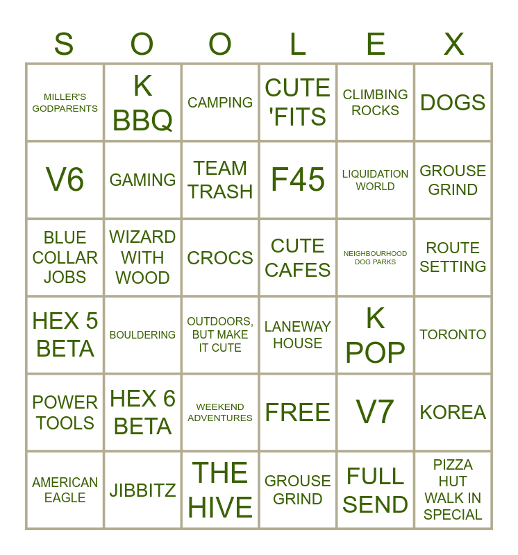 This bingo card has 42 words: FULL SEND, GAMING, MANGOS, NEIGHBOURHOOD DOG PARKS, TORONTO, BOULDERING, BLUE COLLAR JOBS, SOOBARU, CAMPING, ROUTE SETTING, CROCS, F45, GROUSE GRIND, CLIMBING ROCKS, JIBBITZ, HEX 5 BETA, KOREA, LIQUIDATION WORLD, PIZZA HUT WALK IN SPECIAL, K BBQ, DOGS, WEEKEND ADVENTURES, POWER TOOLS, MILLER'S GODPARENTS, HAWT DEAL, AMERICAN EAGLE, TEAM TRASH, BOWEN ISLAND, HEX 6 BETA, V7, MCDONALD'S BREAKFAST, CUTE CAFES, V6, K POP, THE HIVE, OUTDOORS, BUT MAKE IT CUTE, LANEWAY HOUSE, WIZARD WITH WOOD, FREE, GROUSE GRIND, CUTE 'FITS and WE LOVE YOU.