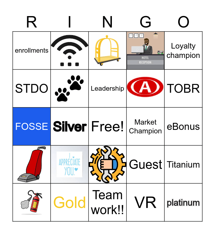 This bingo card has 19 images, a free space and 22 words: FOSSE, ambassador, Gold, Leadership, Loyalty champion, Silver, platinum, eBonus, Market Champion, enrollments, Titanium, Team work!!, RFSH, 4PM c/o, VR, TOBR, FEMA, Guest, STDO, ONBR, Sales and GXP.
