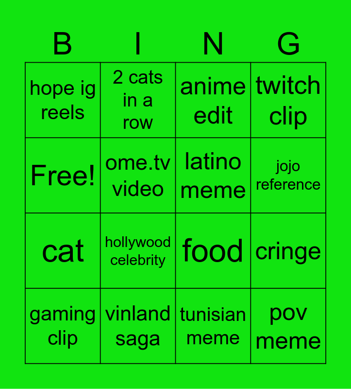 This bingo card has 16 words: vinland saga, cringe, anime edit, hope ig reels, cat, 2 cats in a row, food, tunisian meme, Free!, ome.tv video, gaming clip, twitch clip, hollywood celebrity, jojo reference, latino meme and pov meme.