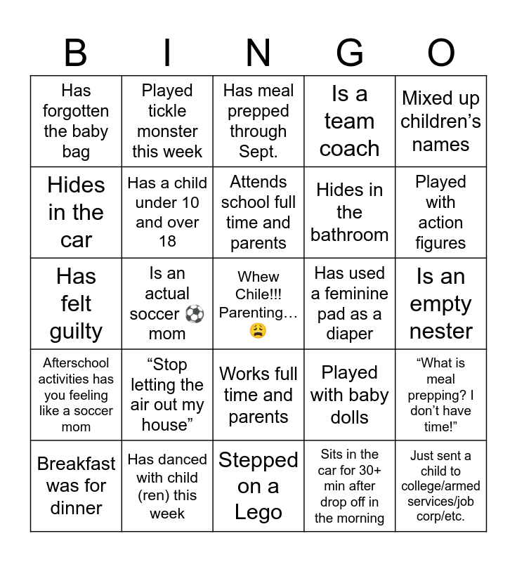 This bingo card has a free space and 40 words: Has given in to ice cream for dinner, Has felt guilty, Has attended children’s graduation from PreK/K & high school in the same year, Has a child under 10 and over 18, Has danced with child (ren) this week, Works full time and parents, Attends school full time and parents, Is raising grandkids, Mixed up children’s names, Afterschool activities has you feeling like a soccer mom, Is an actual soccer ⚽️ mom, Is a team coach, Just sent a child to college/armed services/job corp/etc., Is an empty nester, Has used a feminine pad as a diaper, “Stop letting the air out my house”, “Y’all not gon’ keep running in & out”, Has forgotten the baby bag, Dropped off the kids with house shoes and bonnet/headscarf, Has meal prepped through Sept., “What is meal prepping? I don’t have time!”, Sits in the car for 30+ min after drop off in the morning, Hides in the bathroom, Hides in the car, Has made a meal out of snacks, “I can’t have nothing for myself!”(Food), Has used the screen for a lil bit of quiet/me time. 🤫, Secretly loves Bluey, Rocks out to Gracie’s Corner w/o the kids, “Dinner is whatever I can find in 5-10 min.”, “I’m not one of your lil’ friends.”, Breakfast was for dinner, Forgot to pack lunches, Played with baby dolls, Played with action figures, Stepped on a Lego, Colored with your child(ren) this week, Secretly likes baby food, Played tickle monster this week and “You smell like outside”.