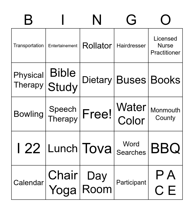 This bingo card has a free space and 68 words: Crafts, P A C E, 55 & older, Clinic, Recreation, Social Work, Entertainement, Registered Nurses, Dietary, E & O, Tova, Care Plans, Monmouth County, Licensed Nurse Practitioner, Occupational Therapy, Physical Therapy, Speech Therapy, Transportation, BINGO, Lunch, Buses, Word Searches, I 22, UNO, No Smoking, GrandPad, Puzzles, WoodStock, BBQ, Walker, Rollator, Breakfast, Music, Rehab, Hairdresser, Cane, Shower Chair, Calendar, Books, Bowling, Brass Band, RedBird, Bible Study, Juicing, LRC, White Board, Spiritual Music, Women's Group, Water Color, Chair Yoga, Coffee Clutch, Piano, Prize Cart, Day Room, Dining Room, Laundry, Participant, Escort, Wheelchair, Advanced Nurse Practitioner, CHHA, Center Aids, History Class, Patio, Garden, ID Badges, Jewlery and Karaoke.