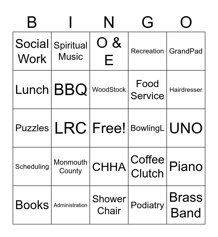 This bingo card has a free space and 81 words: Entertainement, Registered Nurses, O & E, Crafts, P A C E, Dietary, Tova, Care Plans, Speech Therapy, Transportation, 55 & older, Clinic, Recreation, Social Work, BINGO, Lunch, Buses, Monmouth County, I 22, UNO, No Smoking, GrandPad, Puzzles, WoodStock, BBQ, Walker, Rollator, Breakfast, Music, Rehab, Hairdresser, Cane, Shower Chair, Calendar, Books, BowlingL, icensed Nurse Practitioner, Occupational Therapy, Physical Therapy, Word Searches, Brass Band, RedBird, Bible Study, Juicing, LRC, White Board, Spiritual Music, Women's Group, Water Color, Chair Yoga, Coffee Clutch, Piano, Prize Cart, Day Room, Dining Room, Laundry, Participant, Escort, Wheelchair, Advanced Nurse Practitioner, CHHA, Center Aids, History Class, Patio, Garden, ID Badges, Jewlery, Karaoke, Bold Age, Toast, Medical Records, Scheduling, Administration, Team A, Team B, Team C, Hearing Aids, Podiatry, Dentistry, Food Service and LOC.