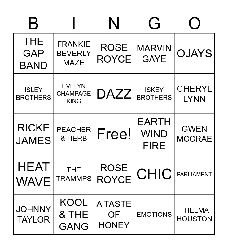 This bingo card has a free space and 25 words: THE TRAMMPS, A TASTE OF HONEY, DAZZ, JOHNNY TAYLOR, OJAYS, THE GAP BAND, ISLEY BROTHERS, FRANKIE BEVERLY MAZE, EARTH WIND FIRE, ROSE ROYCE, ISKEY BROTHERS, RICKE JAMES, CHIC, PARLIAMENT, EVELYN CHAMPAGE KING, BETTY WRIGHT, GWEN MCCRAE, ROSE ROYCE, CHERYL LYNN, PEACHER & HERB, THELMA HOUSTON, KOOL & THE GANG, HEAT WAVE, MARVIN GAYE and EMOTIONS.