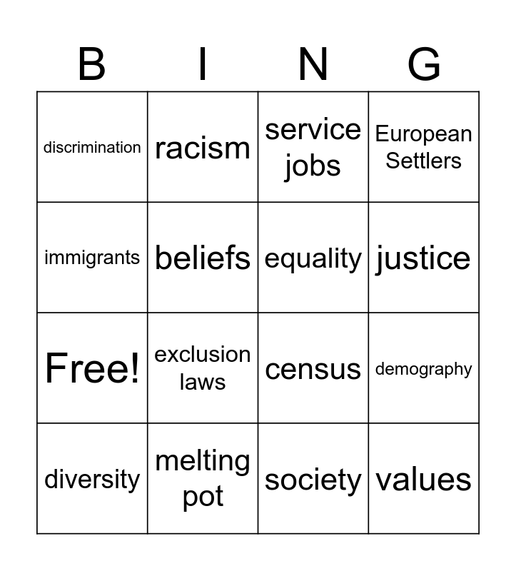 This bingo card has 20 words: demography, sunbelt, service jobs, babyboom, diversity, immigrants, melting pot, discrimination, Free!, racism, exclusion laws, census, beliefs, values, equality, freedome, justice, European Settlers, society and community.
