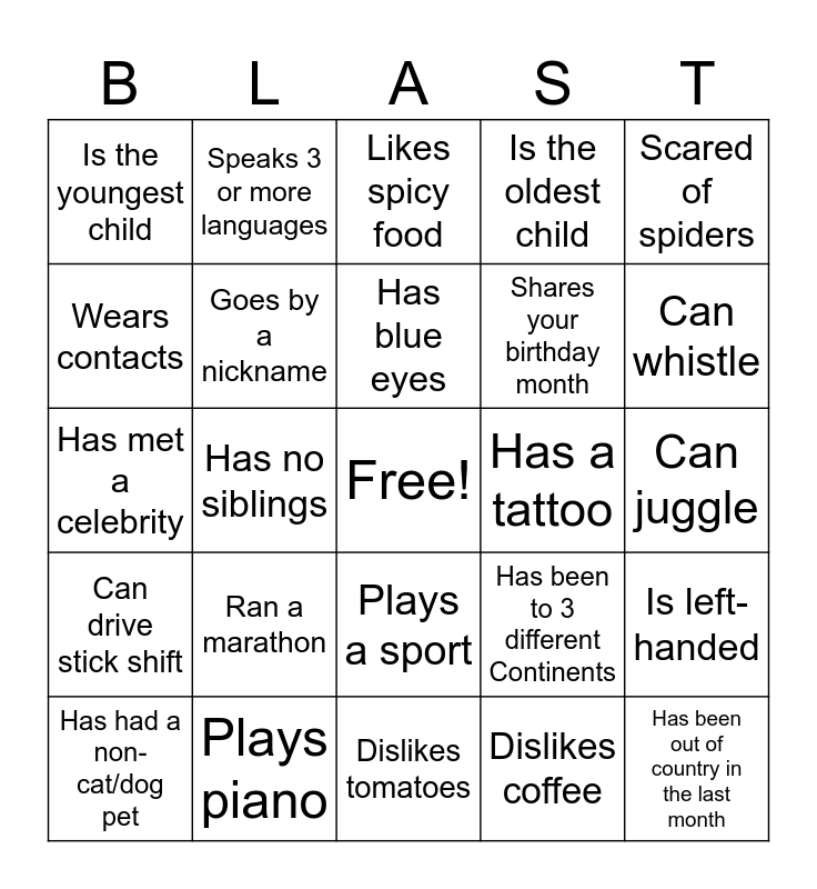 This bingo card has a free space and 34 words: Never had a speeding ticket, Prefers Pepsi over Coke, Has the same hobby, Can touch their toes, Can juggle, Wears contacts, Goes by a nickname, Dislikes tomatoes, Shares your birthday month, Has been out of country in the last month, Has met a celebrity, Speaks 3 or more languages, Dislikes coffee, Has visited Europe, Can drive stick shift, Has no siblings, Plays a sport, Has a tattoo, Is left-handed, Has had a non-cat/dog pet, Plays piano, Dislikes your favourite food, Is the oldest child, Can whistle, Has has stitches, Ran a marathon, Likes spicy food, Over 6 feet tall, Scared of spiders, Is the youngest child, Has broken a bone, Has blue eyes, Has been to 3 different Continents and Has the same favourite colour.