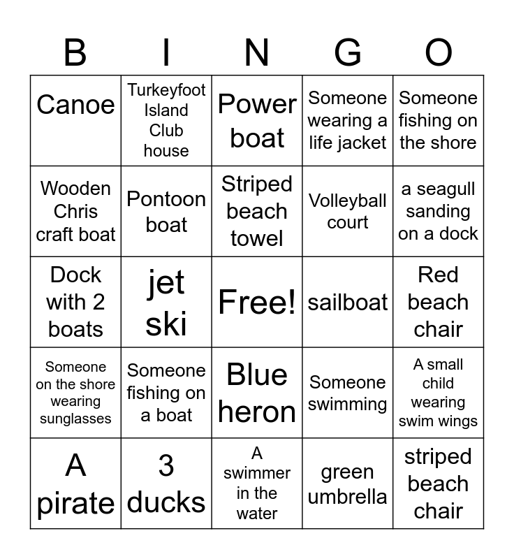 This bingo card has a free space and 30 words: 3 ducks, 3 Canadian Geese, jet ski, Kayak, Canoe, Power boat, Pontoon boat, Blue heron, sailboat, A swimmer in the water, Red beach chair, striped beach chair, green umbrella, a seagull in the water, a seagull sanding on a dock, Someone wearing flip flops, Someone swimming, Someone on the shore wearing sunglasses, Someone fishing on a boat, Someone fishing on the shore, Dock with 2 boats, The Harbor Inn, Turkeyfoot Island Club house, Volleyball court, Wooden Chris craft boat, Someone wearing a life jacket, A small child wearing swim wings, A pirate, Striped beach towel and plastic owl on a dock.