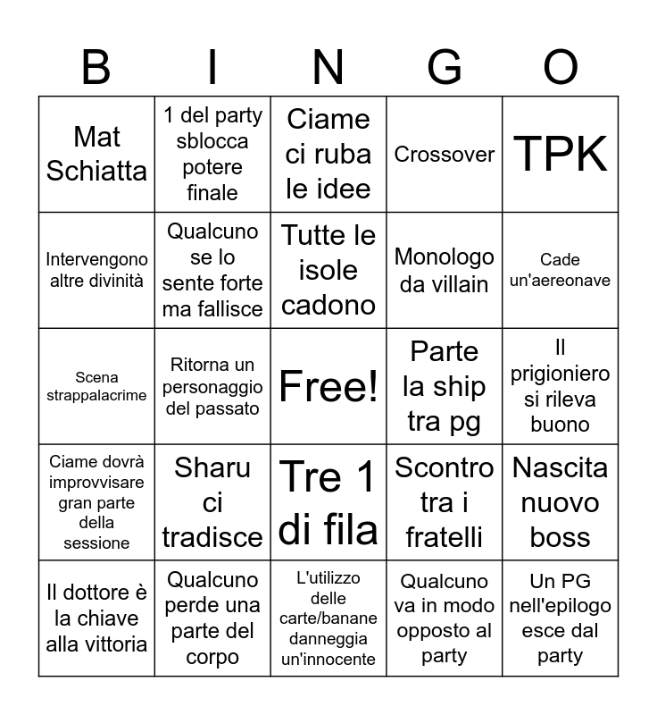 This bingo card has a free space and 24 words: Sharu ci tradisce, Qualcuno perde una parte del corpo, Tutte le isole cadono, Il dottore è la chiave alla vittoria, TPK, Mat Schiatta, Intervengono altre divinità, 1 del party sblocca potere finale, Parte la ship tra pg, Tre 1 di fila, Monologo da villain, Scena strappalacrime, Scontro tra i fratelli, Nascita nuovo boss, Qualcuno se lo sente forte ma fallisce, Qualcuno va in modo opposto al party, Il prigioniero si rileva buono, Ciame ci ruba le idee, Cade un'aereonave, Ritorna un personaggio del passato, Un PG nell'epilogo esce dal party, Ciame dovrà improvvisare gran parte della sessione, Crossover and L'utilizzo delle carte/banane danneggia un'innocente.