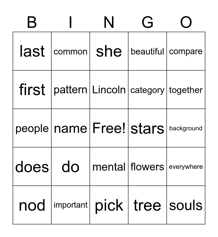 This bingo card has a free space and 63 words: call, different, everyone, everywhere, friend, like, common, unique, Lincoln, other, mental, image, background, compare, contrast, first, name, last, vocabulary, category, do, does, beautiful, grow, hard, home, leave, miss, together, wait, breezes, strange, them, hate, together, nod, smile, tree, visualize, pattern, people, stars, eyes, sun, souls, important, both, flowers, vegetables, beans, corn, pick, home, city, life, she, he, it, they, him, her, us and them.