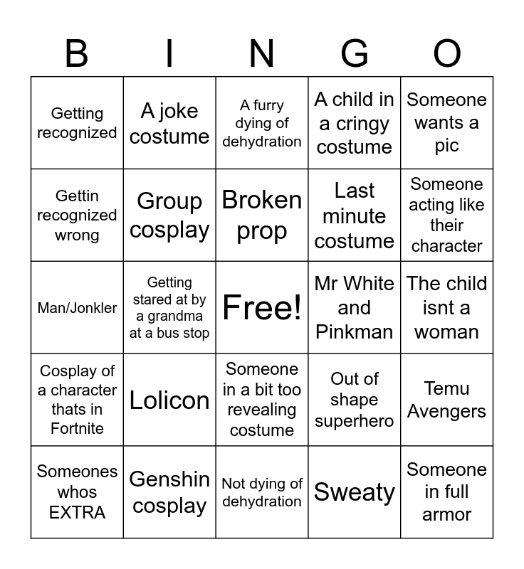 This bingo card has a free space and 24 words: Lolicon, Genshin cosplay, Broken prop, Someones whos EXTRA, Someone wants a pic, Getting recognized, Gettin recognized wrong, A joke costume, Mr White and Pinkman, Someone in a bit too revealing costume, Last minute costume, Man/Jonkler, Out of shape superhero, Temu Avengers, Group cosplay, Sweaty, The child isnt a woman, A furry dying of dehydration, Someone acting like their character, Getting stared at by a grandma at a bus stop, Someone in full armor, Cosplay of a character thats in Fortnite, A child in a cringy costume and Not dying of dehydration.