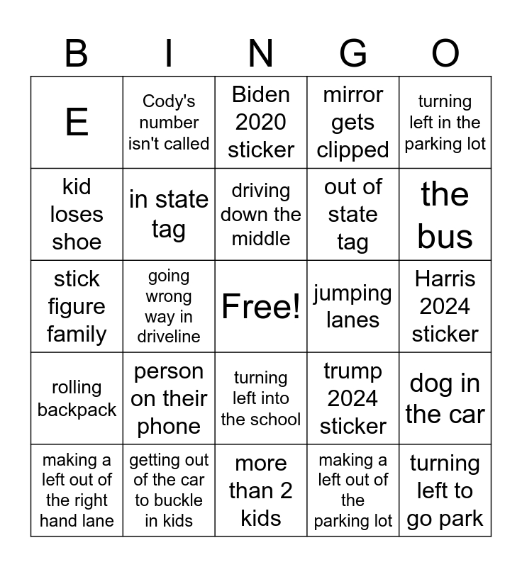 This bingo card has a free space and 24 words: person on their phone, getting out of the car to buckle in kids, driving down the middle, making a left out of the right hand lane, turning left in the parking lot, E, kid loses shoe, Cody's number isn't called, jumping lanes, turning left into the school, out of state tag, stick figure family, trump 2024 sticker, dog in the car, in state tag, making a left out of the parking lot, Harris 2024 sticker, Biden 2020 sticker, the bus, going wrong way in driveline, turning left to go park, rolling backpack, mirror gets clipped and more than 2 kids.